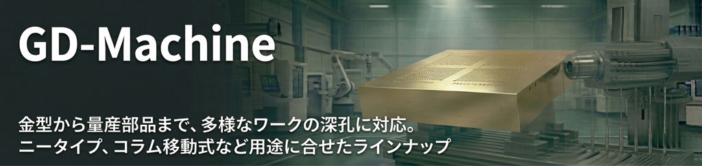 大型金型などの深孔加工用コラム移動式ガンドリル機です。フロアタイプテーブルにより重量・形状制限が少なく、各種ジグ構成により柔軟な加工が可能です。